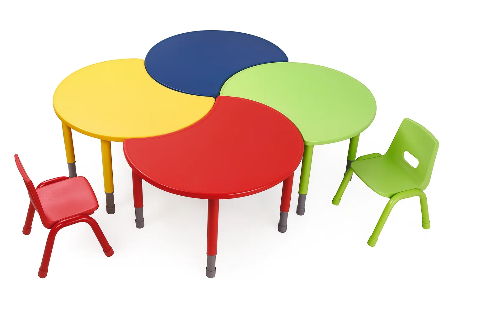 Table frame made of round pipe with adjustable legs in powder coated finish.Top made of 18 mm prelam board with pvc edge. Chair frame made of 38mm round pipe 16 gauge in powder coated finish having injection mould plastic shell. Enhance your dining or classroom experience with our premium CLUSTER SET OF 4 TABLE WITH 8 CHAIRS. This thoughtfully designed set combines durability, comfort, and style, making it ideal for homes, offices, or educational spaces.